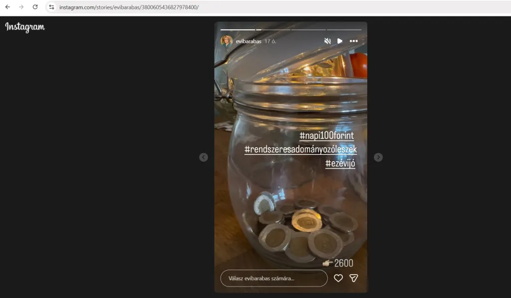 Barabás Évi spórolása nem csupán pénzügyi trükk, hanem mély elköteleződés a jó ügyek iránt. Tavaly év végén döntött úgy, hogy napi száz forintos érmét helyez el egy egyszerű csatos üvegben, amit perselyként használ. Közösségi oldalán megosztotta ezt a követőivel, #arendszeresadományozoleszek hashtaggel buzdítva őket hasonló tettekre. „Napi száz forint nem sok, de kitartással és összefogással komoly vagyonok gyűlhetnek” – üzeni Évi, aki szerint a kis lépések vezetnek nagy eredményekhez.