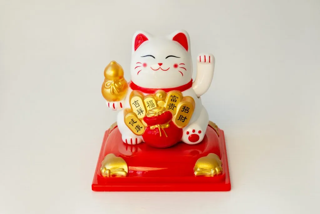 A Maneki-neko, azaz az integető macska eredete a 19. századi Japánba nyúlik vissza. A név jelentése „magához hívó macska” – a macska felemelt mancsa mintha hívogatna szerencsét. A figura általában egy ülő macskát mutat, amely integető mozdulatot tesz.