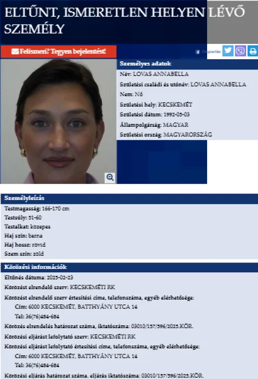 Lovas Annabella, a népszerű tévés műsor, a Nagy Ő korábbi szereplője ismét eltűntként keresett személy lett. A 32 éves nő tavaly novemberben a Kanári-szigeteken tűnt el, de előkerült, most azonban február óta nincs nyoma. A rendőrség és a család aggodalma nő, miközben a háttérben komoly személyes krízisek húzódnak meg.